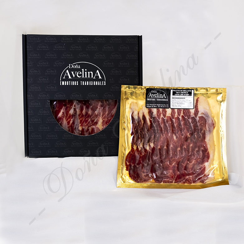 EMBUTIDOS DOÑA AVELINA: Disfruta de todas las sensaciones de la paleta ibérica junto a la suavidad y jugosidad del cerdo ibérico 100%, en un formato listo para abrir y consumir. Un producto con un sabor y una apariencia inconfundible gracias al intenso veteado de sus carnes.
